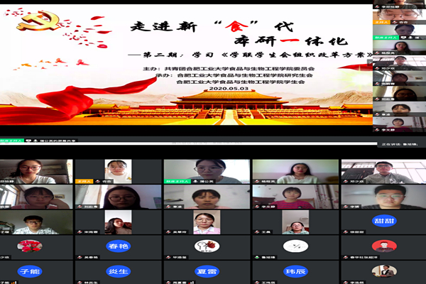 为激发学生组织改革动力,提高组织的积极性、创新性和自主性,使学生组织更好地代表和服务广大同学,2020年5月3日下午3点,bat365官网登录入口通过腾讯会议平台成功举办第二期走进新“食”代系列主题活动。本期活动主题为“学习《学联学生会组织改革方案》”,学院学生会、研究生会全体成员参与此次活动。