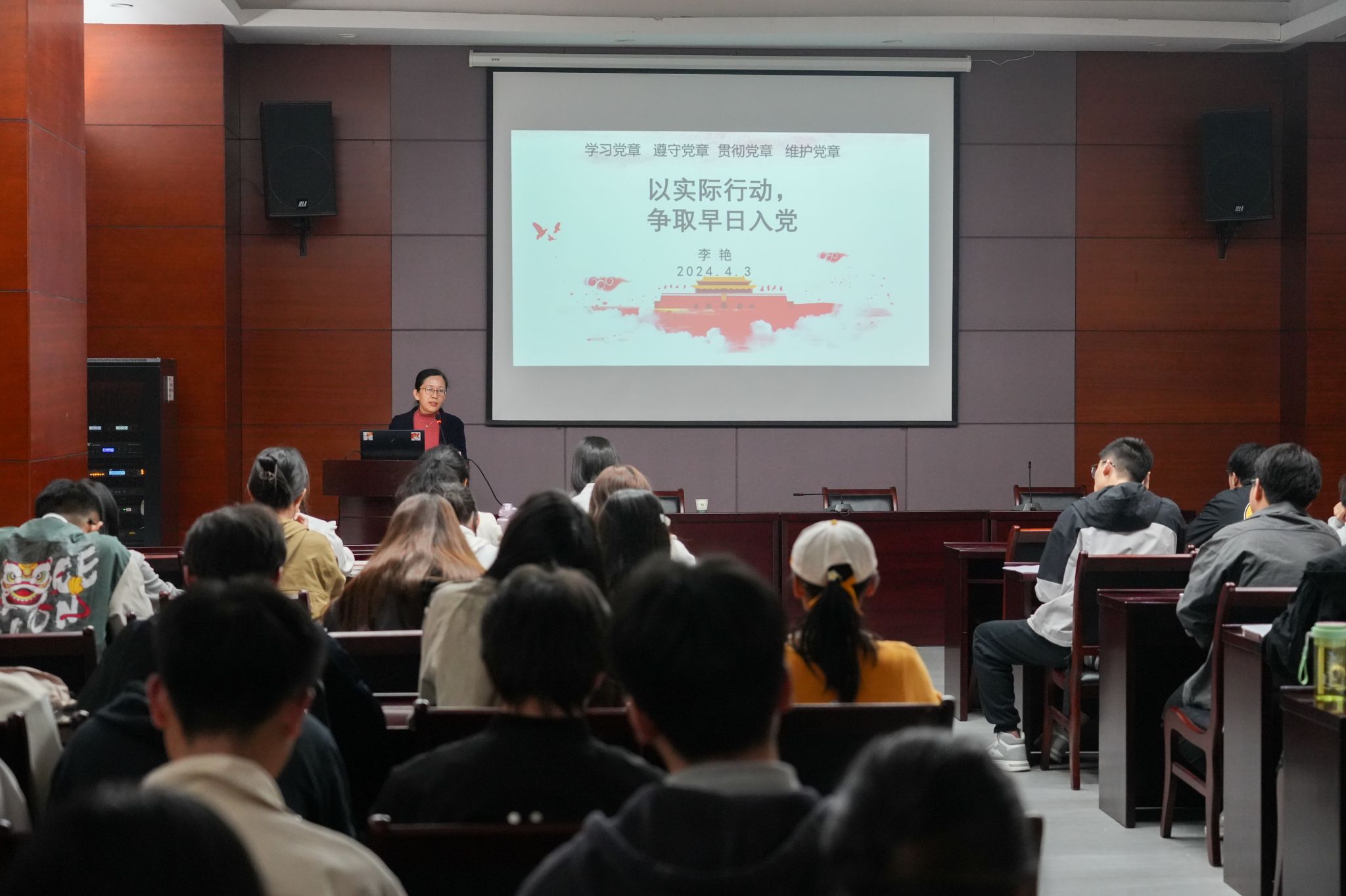 开班典礼结束后,李艳书记给学员们带来了《以实际行动,争取早日入党》专题党课。党课中,李艳首先通过互动方式,引导学员们思考向党组织靠拢的初心,解读回答“我们为什么要入党”这个关键问题,引导学员们端正入党动机。随后,她结合习近平总书记对教育工作和青年学生提出的重要要求和寄予的殷殷嘱托,对培训班学员提出了规划自身成长路径,实现自我人生价值的建议。李艳还带领学员学习了党章内容,引导学员切身体会共产党员坚定的信念和无私奉献的精神,勉励食生学子要做信念坚定的时代新人,坚定不移听党话、跟党走,为国家大健康战略贡献青春。最后,她通过警示教育案例,引导全体学员要牢记全心全意为人民服务的初心,树立廉洁意识,增强纪律意识。