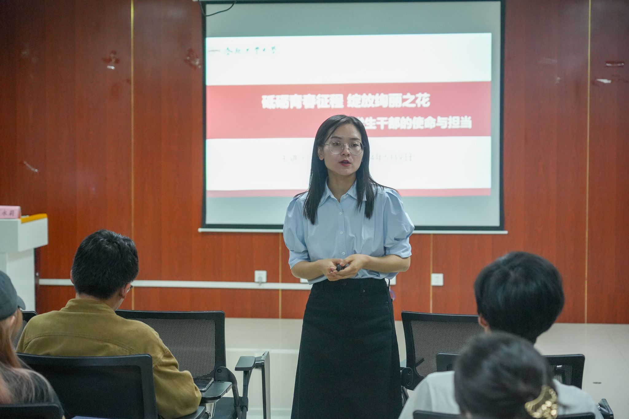 开班典礼后,葛永莉向学员班讲授了题为“砥砺青春征程,绽放绚丽之花——学生干部的使命与担当”主题课程。她从学院学生干部队伍建设情况、学生干部必备素养和要求,以及学生干部的工作方法等三个方面展开讲授,期间她引入党史故事,引导学生干部在坚定理想信念上作表率;讲述学院优秀校友张铁鑫扎根基层的故事,引导学生干部在担当作为上做表率;列举网络上某些学生干部的不良作风,引导学生干部在甘于吃苦上作表率;讲述学院2024届安徽省优秀毕业生、校优秀毕业生王梓涵的事迹,引导学生干部在奋斗奉献上作表率。最后,她和同学们一起探讨了学生干部的工作方法。授课氛围热烈,同学们积极互动,并纷纷表示不负学院和组织的信任,做有理想、敢担当、能吃苦、肯奋斗的新时代好青年。