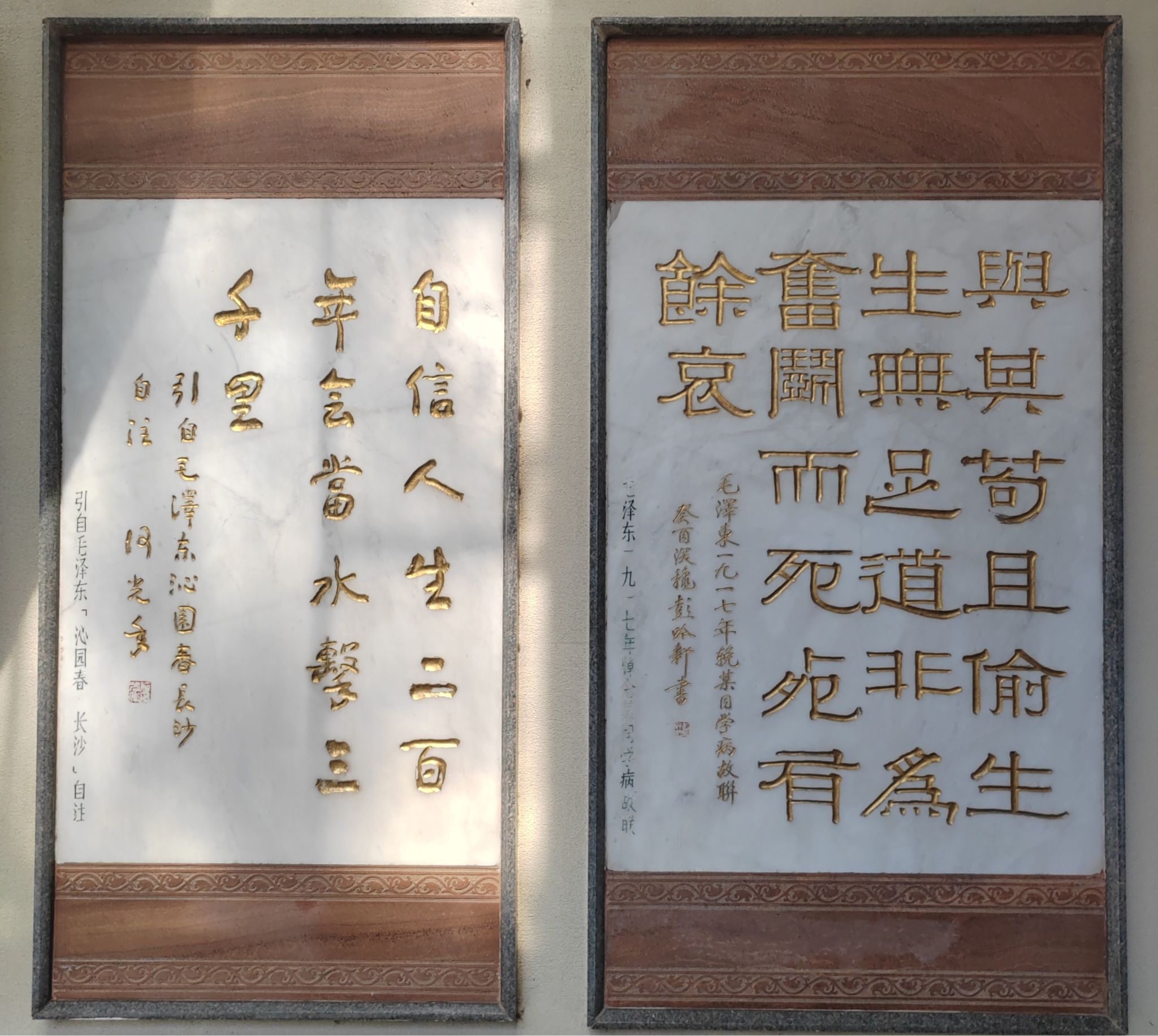 团队一行人踏入了一个充满文化底蕴和艺术魅力的地方,它宛如一条历史长河,静静诉说着毛泽东同志的革命光辉岁月。沿着碑廊缓步向前,队员们停下脚步,围聚在一幅幅书法作品前,“独立寒秋,湘江北去……”熟悉的诗词似是唤醒了沉睡的澎湃,振奋人心。“自信人生二百年,会当水击三千里”,透过苍劲有力的文字,团队成员仿佛看到了青年毛泽东求学时不畏艰难、奋发图强的豪情壮志。