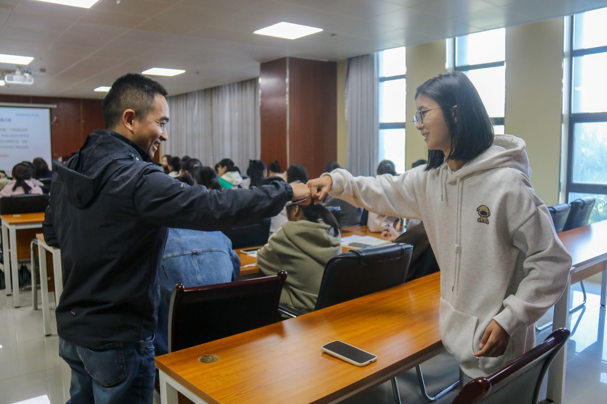 接着,合肥市人社局公共就业人才中心交流合作部部长林云涛以“奋斗正青春,就业正当时”为主题,与大家分享了当前就业形势及如何积极应对。他通过两个互动小游戏——“鼓掌游戏”和“相同点发现”,让参与者在轻松愉快的氛围中认识到想象与现实之间的差距,增强团队协作意识和求职信心。在交流环节中,他分享了求职技巧,并指导同学们如何获取相关就业政策信息,引导她们积极主动地进行职业探索。