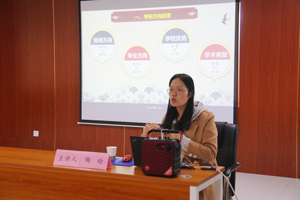 bat365官网登录入口副教授、我校优秀班主任陶晗以“探索考研方向与信息检索”为主题,从地域方向、专业方向、学校优势、学术类型等多方面系统梳理考研方向选择的策略,并介绍了信息检索的详尽方案;