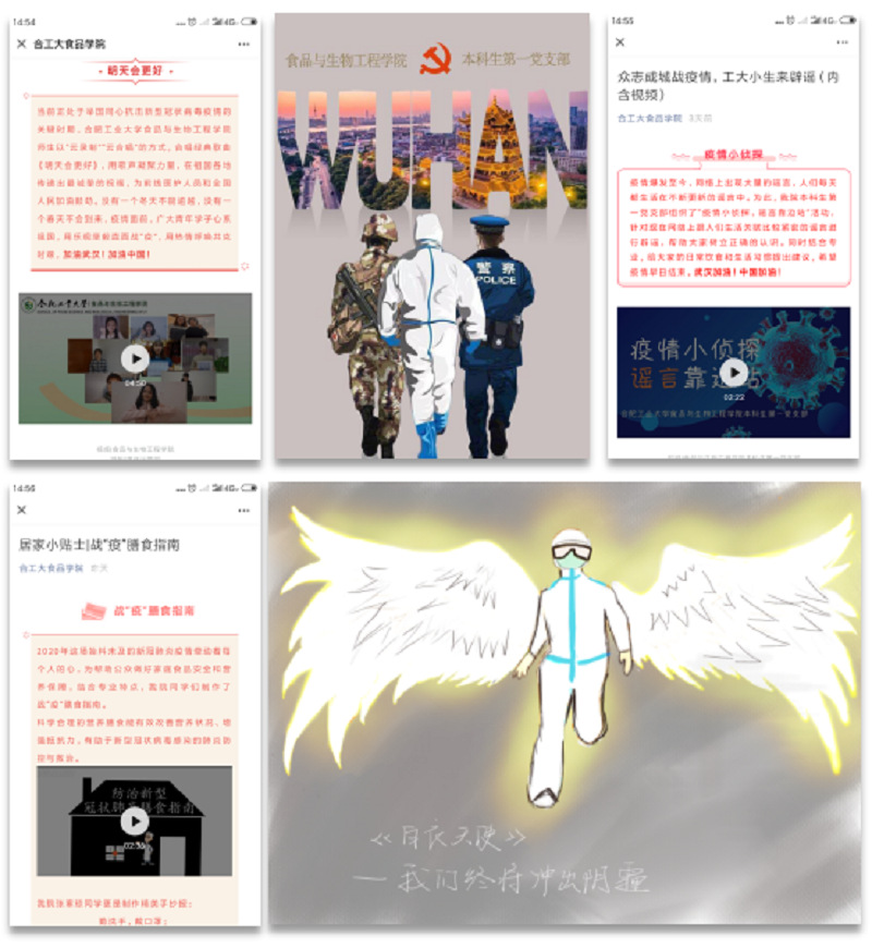“面对疫情不要慌,工大小生来帮忙,疫情谣言靠边站,科学膳食听我讲。”学生党支部创新防疫宣传形式,组织党员绘制“致敬逆行者”系列电子海报、《白衣天使》原创绘画作品及《众志成城、共抗疫情》手抄报并通过学院微信公众号发布,向一线医护工作人员表达敬意,向学院师生发出号召。策划实施“我的家乡我的家&防疫”科普短视频制作、“科学有序防新冠”征文等丰富多彩的线上“第二课堂”活动,带动学生齐心协力共抗疫情。党员同志还发挥专业特长优势,制作发布“疫情小侦探,谣言靠边站”科普辟谣、“‘战’时膳食指南”“助力防疫,食力无惧”微视频,以及“众志成城战疫情,工大小生来辟谣”系列推文,发出富有特色的抗疫强音,让正能量始终充盈网络空间。