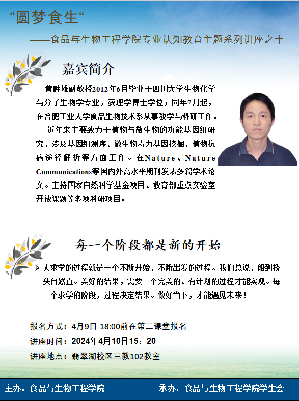 黄胜雄副教授2012年6月毕业于四川大学生物化学与分子生物学专业,获理学博士学位;同年7月起,在合肥工业大学食品生物技术系从事教学与科研工作。