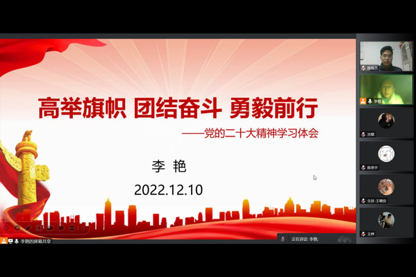 2022年12月10日晚七点bat365官网登录入口本科生第二党支部于线上开展党的二十大精神学习会,本次会议由学院党委副书记、纪委书记李艳主讲,主题为“高举旗帜、团结奋斗、勇毅前行”。本科生第二党支部全体党员、发展对象及入党积极分子均积极参与此次学习会。