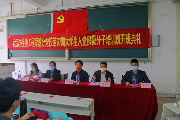 4月6日下午15:00,bat365官网登录入口第67期入党积极分子培训班(苗子班)暨第一期食声讲堂开班典礼于翡翠湖校区七教304隆重举行。党委宣传部正处级组织员、学校原党校常务副校长姚跃传,bat365官网登录入口党委书记、分党校校长陈从贵,学院党委副书记兼纪委书记、分党校副校长李艳,bat365官网登录入口团委书记万代林,以及113名学员参加了开班仪式,其中包括四名因疫情防控暂缓返校的、在线参加开班典礼的学生。第67期入党积极分子培训班班主任努尔比耶姆主持开班典礼。